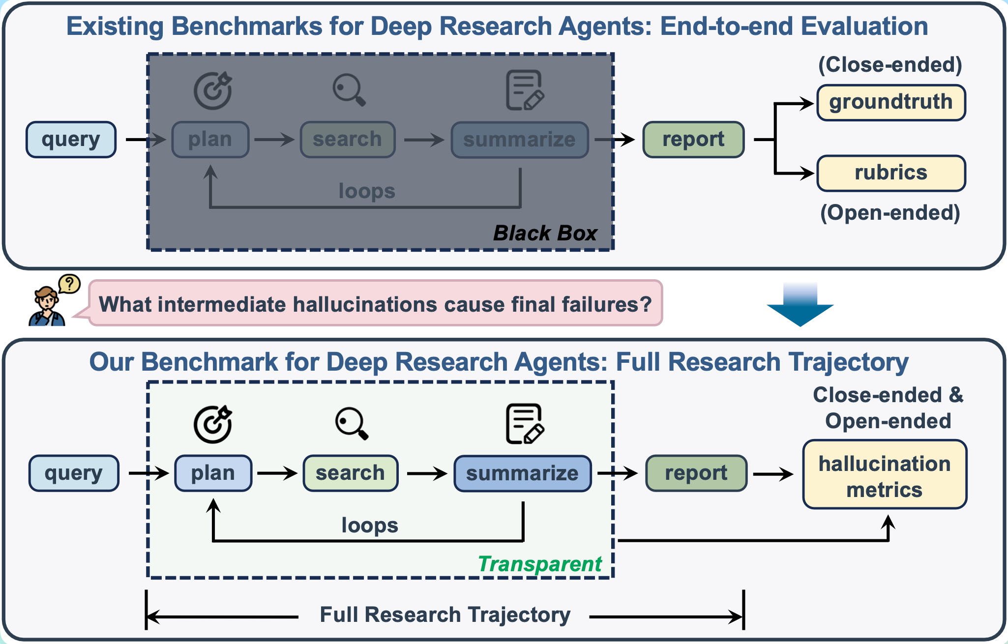 Why Your Deep Research Agent Fails? On Hallucination Evaluation in Full Research Trajectory